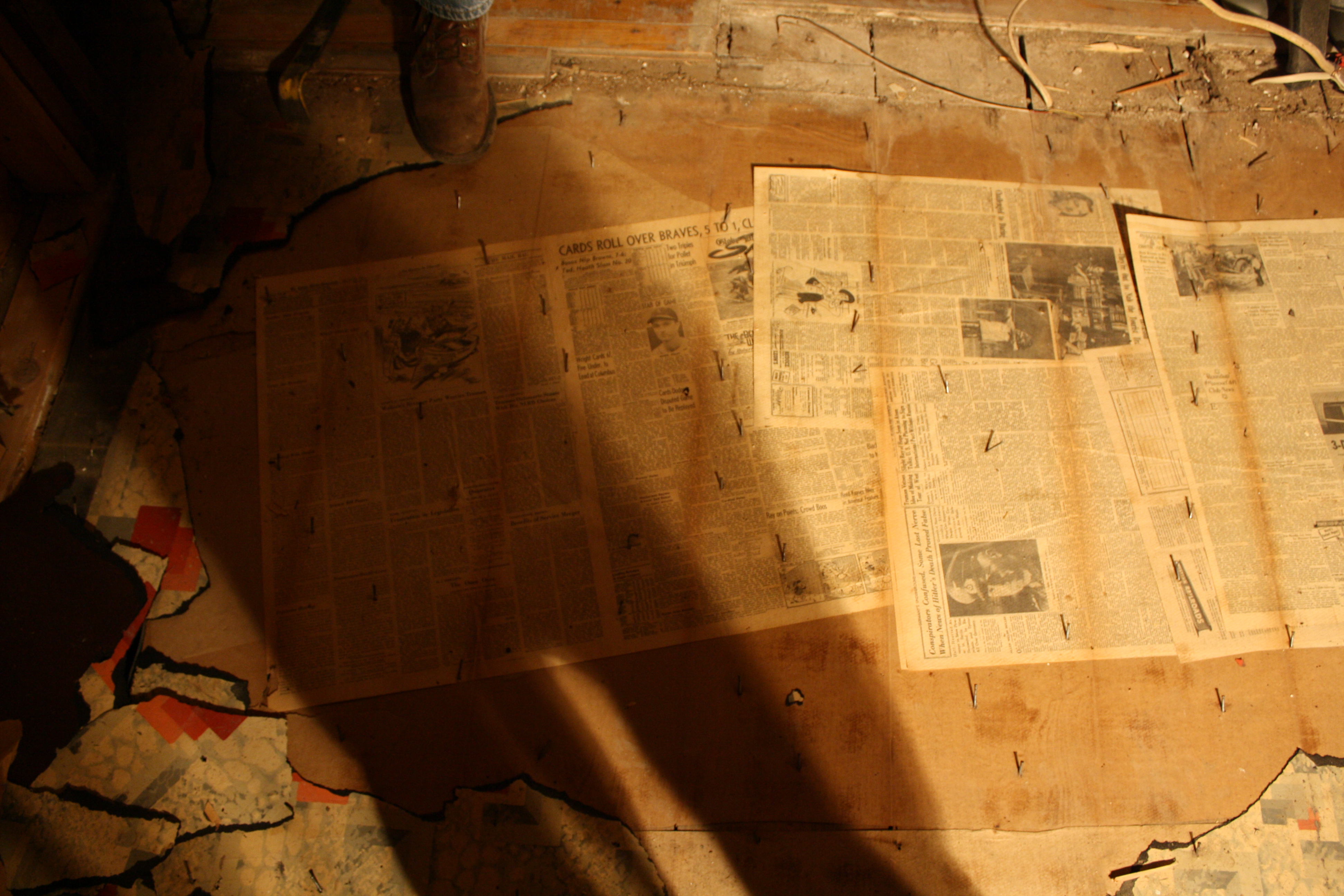 Life & Living #2 Posted by Stephanie on February 24, 2011 #2 of 19 These old newspapers were put under our floor. We found them during our kitchen remodel. Like Loading... Related