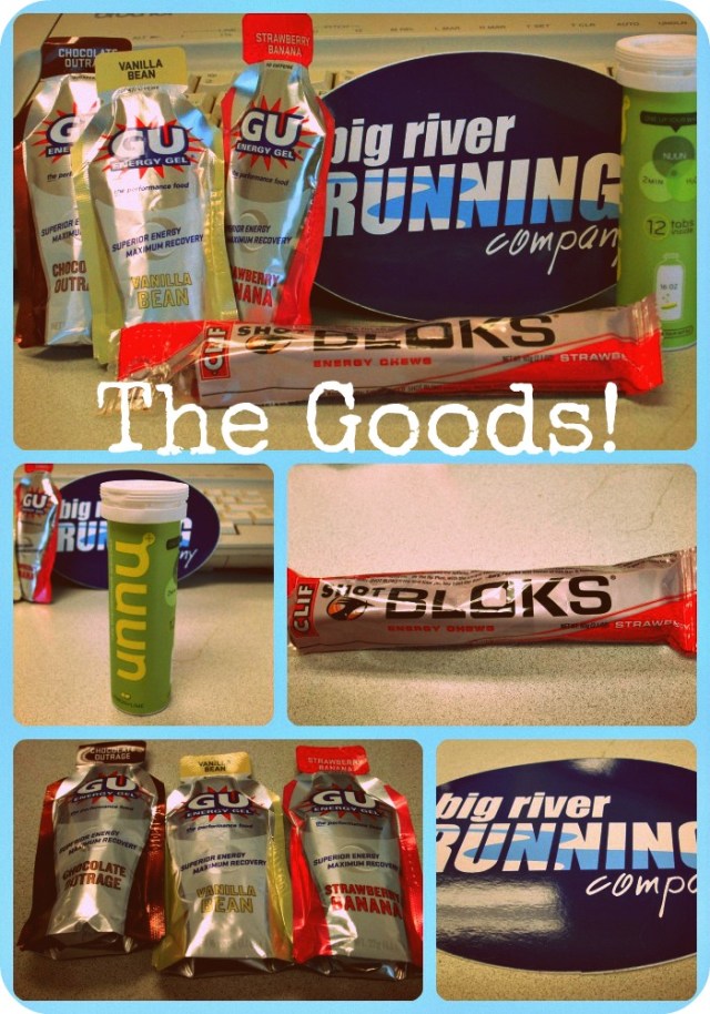 The winner of this giveaway will receive the following- 1 tube of lemon-lime Nuun, 3 packets of Gu gels, in vanilla, chocolate, and strawberry banana, 1 package of strawberry Gu shot bloks, and a sticker from my favorite running shop and race service provider, Big River Running Company.