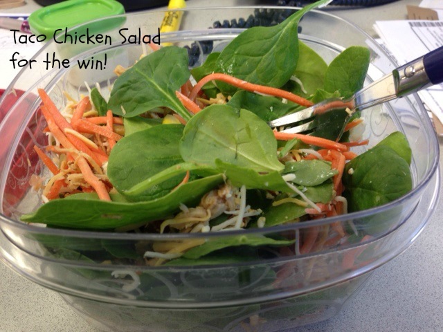 Last night, after yoga class (in which I remained face plant free!) I stopped at Target because I had to pick up a few things. Then by the time I got home, M had already had the rest of the Chicken & Gnocchi soup I made on Sunday and I decided to just have leftovers. I heated up a little bit of the cheesy sausage and potato casserole and then made myself a big salad with some of the left over taco chicken, baby spinach, carrots, black bean & corn “salsa”, regular salsa, cheese, and ranch. So good!