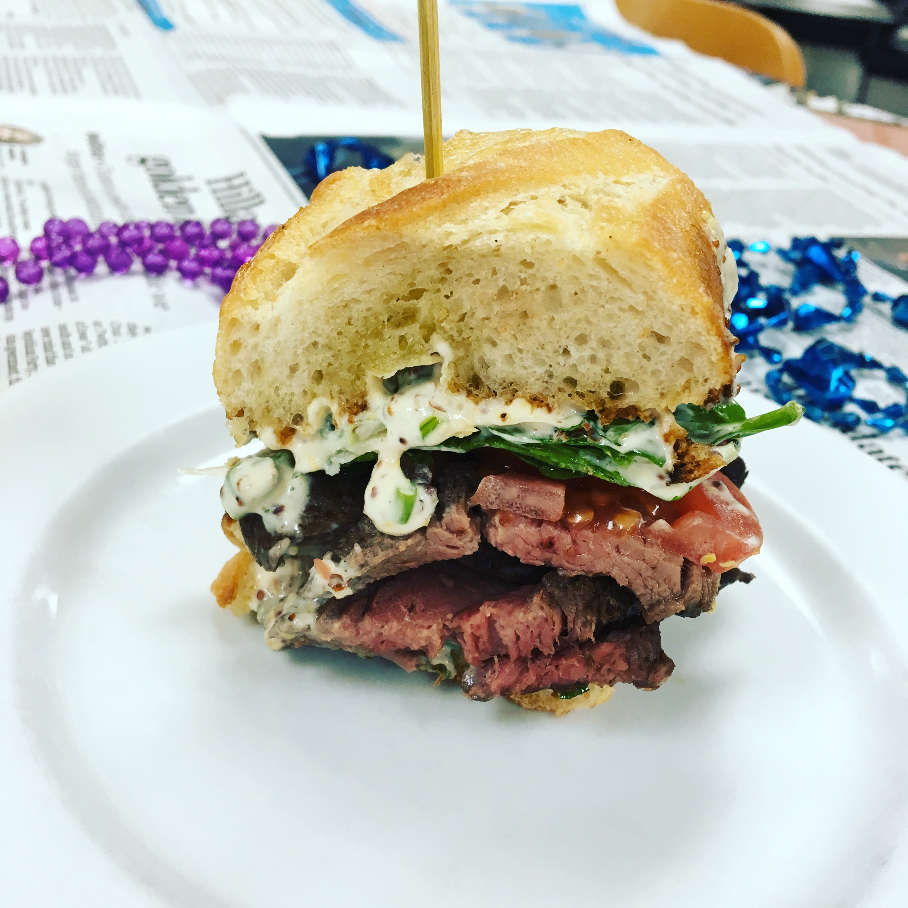The next thing that we went to work on was the chef’s take on a po’boy sandwich. Except since he chose to use a beef tenderloin he referred to it as a rich boy sandwich. This sandwich guys, it was amazing! The chef just kind of threw together some ingredients for a rub for the tenderloin, then we made a spiced mayo to spread on the toasted baguette, then layered it all together with some spinach greens and tomato. Again, something I will definitely post on here when I find the recipe because you need this in your life.
