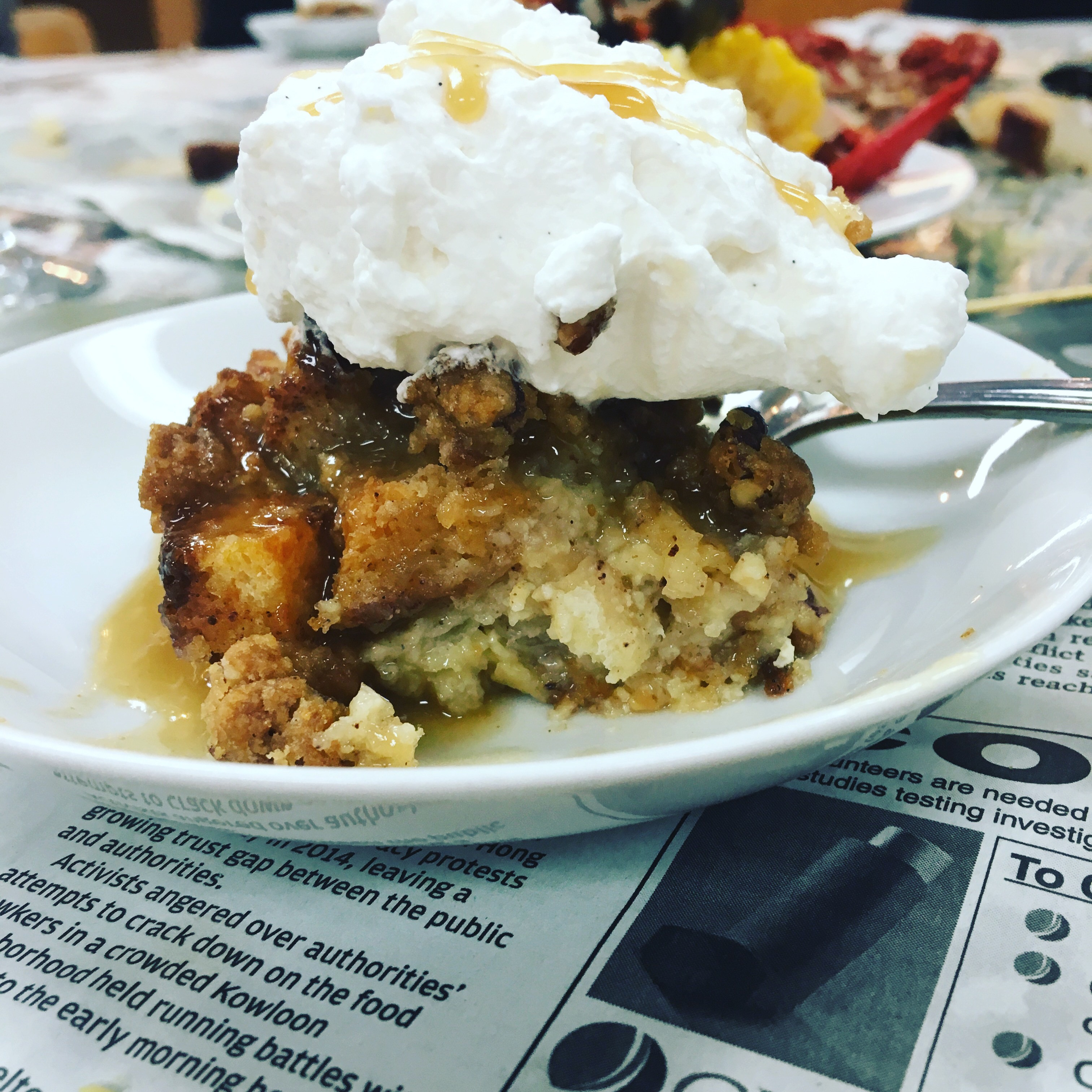 Last but not least, we made dessert. It was a bread pudding with homemade whipped topping and caramel sauce. Adam sliced up the bread and mixed the ingredients together for the “pudding” part and I made the caramel sauce on the stove. It actually had bourbon in it, and even though I am not a soggy bread fan, this shit was pretty freaking good. It did have a lot of dairy in it, so I didn’t eat my whole serving, but it is something that I’d probably make again if I had some bread pudding fans coming to a party I was making desserts for.
