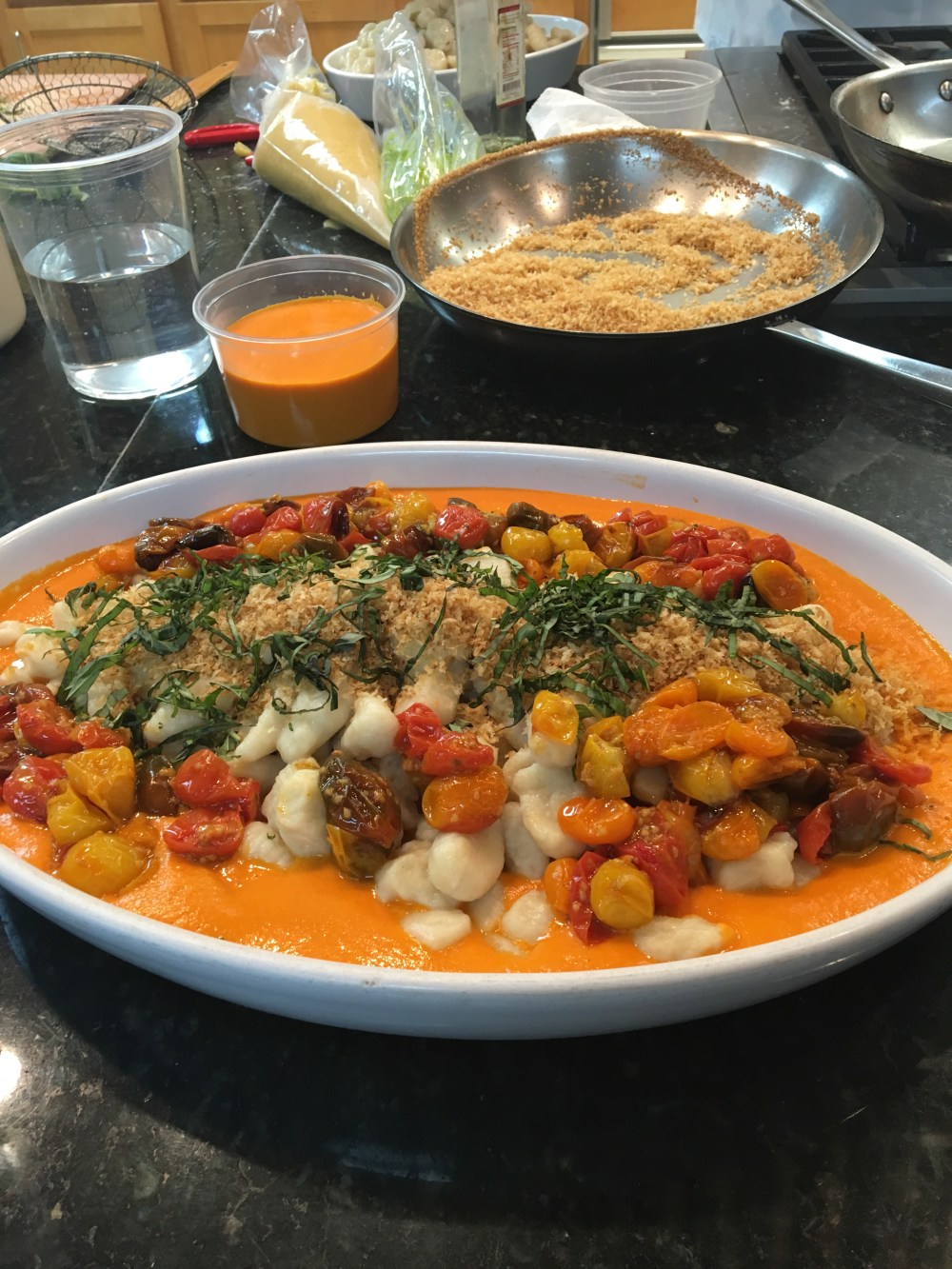We made two different types of gnocchi, potato and a puff pastry type. The chef also showed us how to make green gnocchi with kale in the blender. We made the puff pastry type of gnocchi first, since that “dough” has to sit a for a little while before cooking, and then we watched him work a few sauces up using roasted cherry tomatoes and pesto. Once the potatoes were baked enough, we were able to start making the potato gnocchi. Which is really just a mix of mashed potato and flour with a little salt in there for flavor. I suppose you could add other things in or make them with sweet potatoes, but the class kept it pretty basic. Then it was time to cook them!