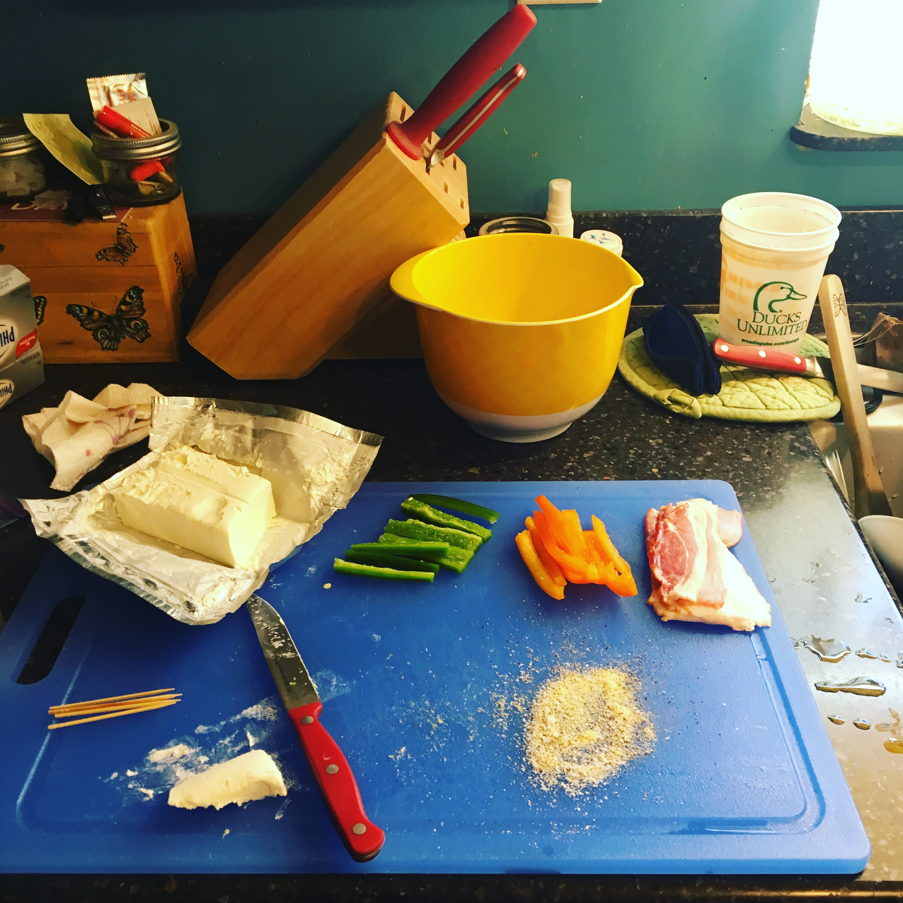 Fast forward to Labor Day weekend and my parents yearly party. I didn’t get to get out and go dove hunting this year, mostly because opening morning was during the work week and then I was busy on Saturday and the party was on Sunday, but Matt went and got a few doves, so for the party I made some dove poppers which were a total hit. I was surprised they went over so well, considering the audience and the fact that they were wild game. You can see my little popper assembly line in the photo. I used jalapeno peppers, sweet orange peppers, cream cheese, bacon, and then a salt/pepper/garlic blend to season the dove, then grilled them once we got to my parents house. I secured them with toothpicks, but will have to remember to soak the picks next time because they did burn, and that causes them to break off really easily, which can be dangerous when eating. No body wants a toothpick chunk stuck in their mouth!