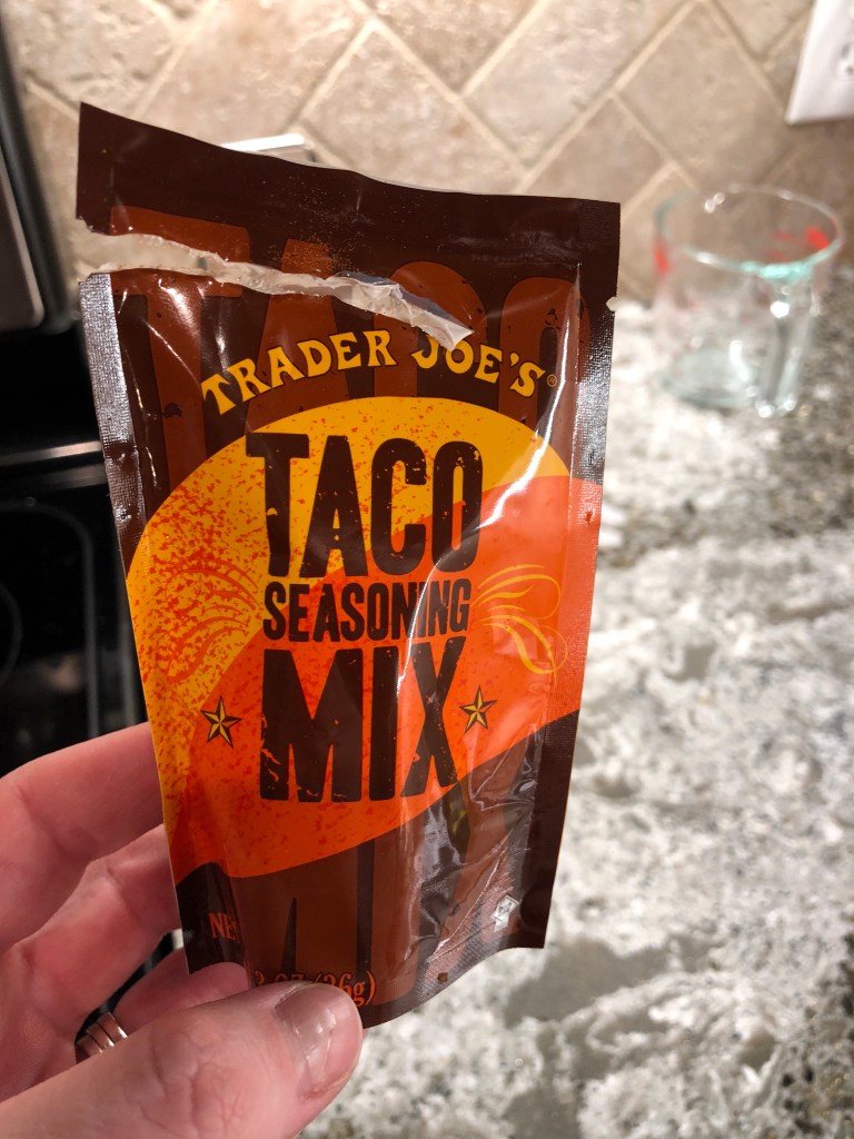 I know there are tons of recipes out there for making your own taco seasoning, but if you’re not about that life, then get thyself to the nearest TJ’s and pick up some of their seasoning. I promise you won’t regret it! We like it so much that last time we bought some, we just bought the entire display box at the store. So now I’m set for taco seasoning for probably close to a year or so.