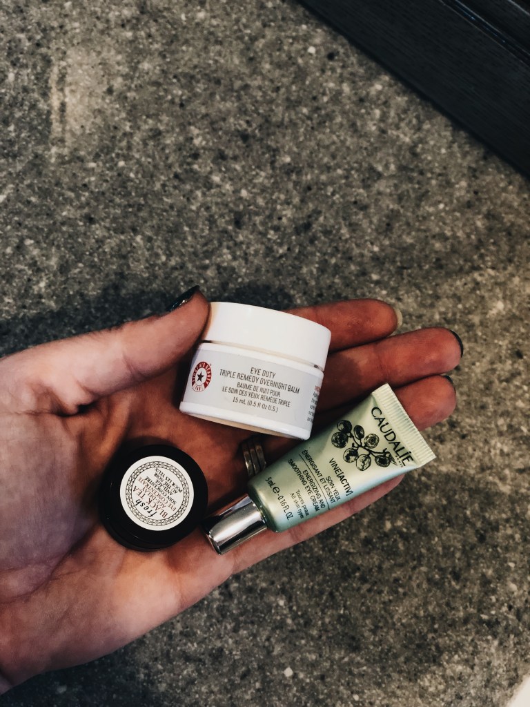 First things first though, eye treatments! The Fresh and Caudalie are both samples that I got with Beauty Insider points. I’m thinking of getting the Fresh in full size, but not 100% sold on it just yet. The First Aid Beauty eye balm is good, but I’ve had that container for a while and don’t really see too much difference when I use it regularly.