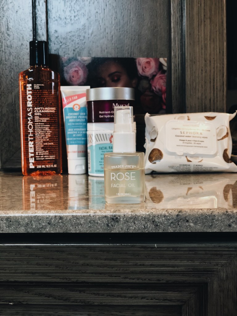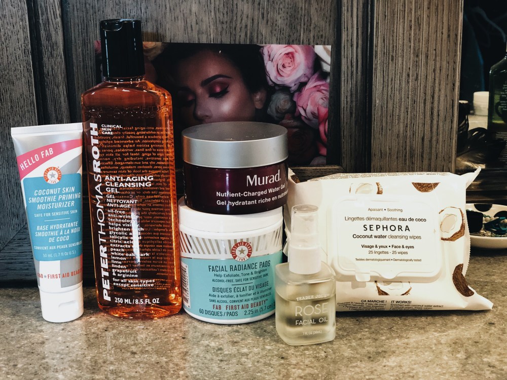 The stuff that I already used and loved are the Trader Joe’s Rose Facial Oil, the FAB Coconut Moisturizer, and the Sephora Coconut Cleansing wipes. I recently added the Murad moisturizer and the two newest additions are the FAB Facial Radiance Pads and the PTR Cleansing gel.