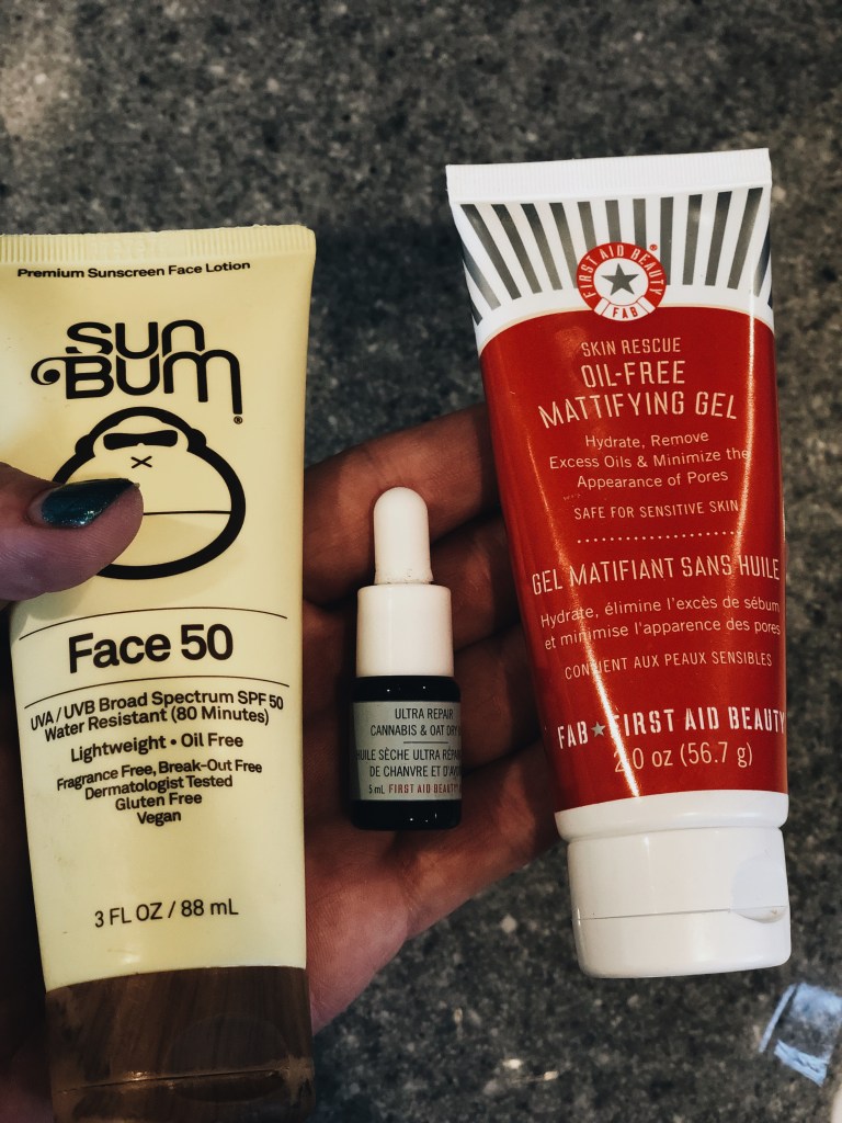 Then we have my favorite brand of sunscreen, Sun Bum! I’ve been using them for a couple of summers now and I love that I can put it on if I start to burn a little and it doesn’t accelerate the burn! I’ve been trying to be more proactive about my sun care since really notice my sun damage on my face and worrying about skin cancer, and this one is light and non-greasy. Also in there is a little bottle of First Aid Beauty Cannabis and Oat facial oil. It came in a sampler set and I’m looking forward to trying it out. I also got a sample from the lovely associate at Sephora. Then I also have the mattifying gel, which I forget about all the time in my drawer. It really helps with oil production and I like to use it under my makeup sometimes.