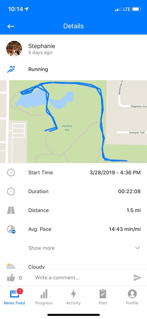 Run number two for the training plan. I still didn’t have a watch at this point so for this run I used both the Runtastic app and the Strava app. Runtastic is nice because it gives you two decimal places while Strava only gave me one, making it a little more difficult to gauge when I needed to turn around. I ran at a new to me park, which was super pretty even though it was rainy out. It was also a little more hilly than I am used to, but according to Runtastic, I managed a 14:43/mile pace with a one minute walk break just after the first mile. I could definitely feel those little hills at the end of the run!
