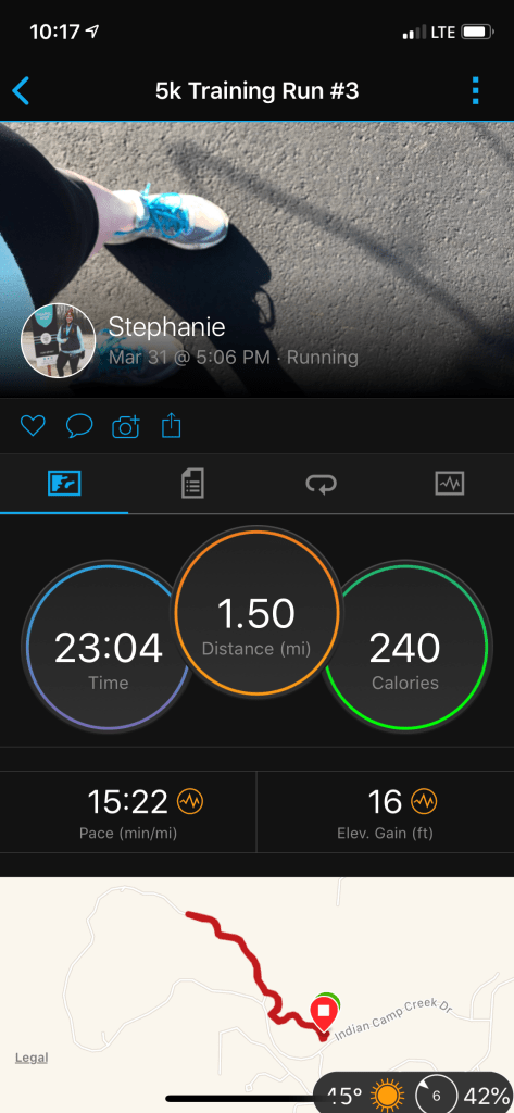 Sunday morning Matt and I ran around and did some errands. One of those errands was stopping at Fleet Feet and getting myself a new Garmin! I still had some money left over from vacation, so I was able to use that to purchase a new watch. I got the Forerunner 645 music, although I probably won’t be using the music feature on it. So after we got home on Sunday, I took it out for it’s maiden voyage. I was definitely feeling a little fatigued and I was having a caffeine withdrawal headache (my bad!) so I was for sure a little on the slower side. I average a pace of 15:22/mile, so not too awful, but a full minute slower than with the other two apps.