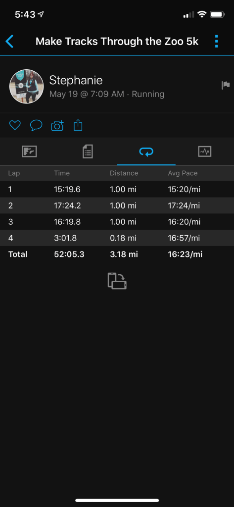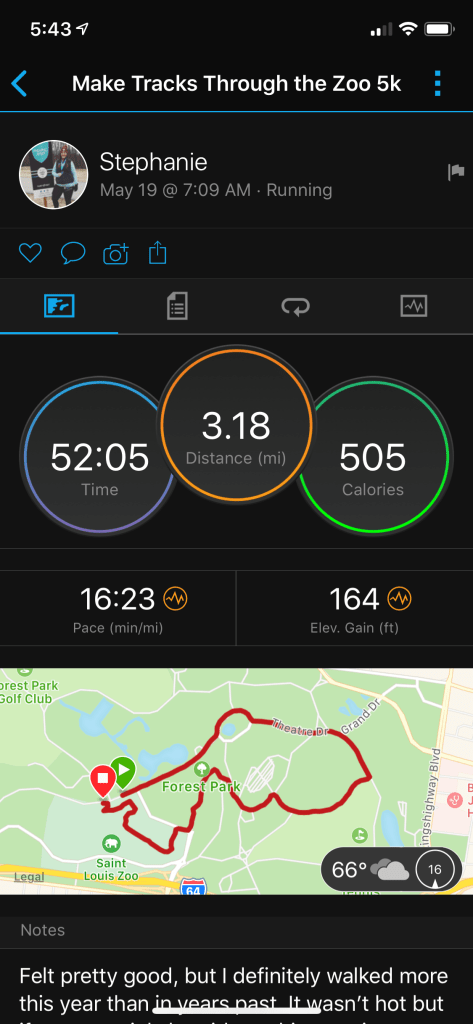 You can tell from my splits that I ran the entire first mile, probably going out a little too fast, but then walked quite a bit in the second mile, which is where most of the hills happened. I took a few walk breaks in the third mile, but there were fewer uphills and that’s when we entered the Zoo, so it was easier to keep motivated. Plus, there was a woman who was running with her friend and she was so supportive that I just kind of hung around them for a bit and soaked up her positive energy. Much better than the mom who did nothing but scold her child for the entirety of the race. Maybe the kid could have had a better, more positive attitude if she wasn’t being told how much of a brat she was being for an hour?
